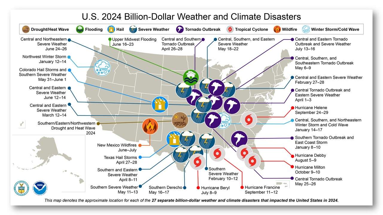Each icon on the map above represents a weather event in 2024 that caused damages exceeding $1 billion (Source: National Centers for Environmental Information)